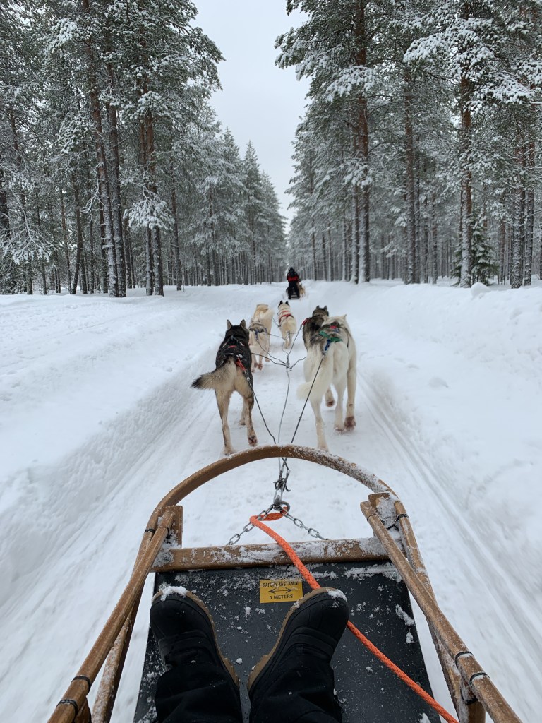 Le quatrième jour nous voilà partis pour l’excursion que j’attendais : les chiens de traineau! C’était magique! Les chiens n’avaient qu’une envie courir à fond dans la neige! C’est un pur régal de découvrir cette activité et d’en profiter dans la nature! Ma fille qui était dans le premier traineau avait une vue imprenable sur la forêt!