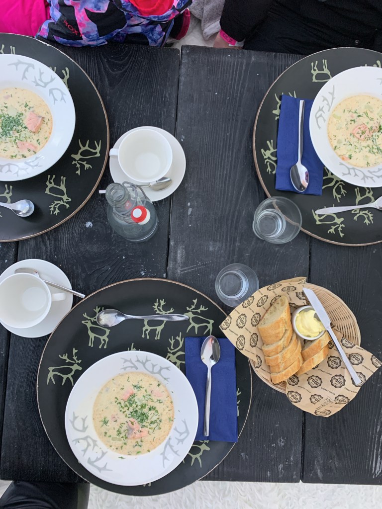 A midi on file manger au restaurant du SnowMan World, un restaurant igloo, dans lequel on déguste des plats typiques Finlandais à savoir du saumon et de la soupe bien chaude pour se réchauffer!